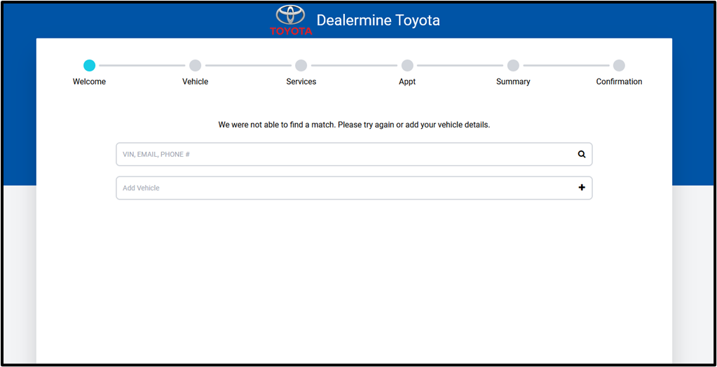 1) If a matching file is not found in Dealermine, the customer will be taken to the below page, where they have the option of trying another search method, or adding a vehicle manually and creating a new account.
