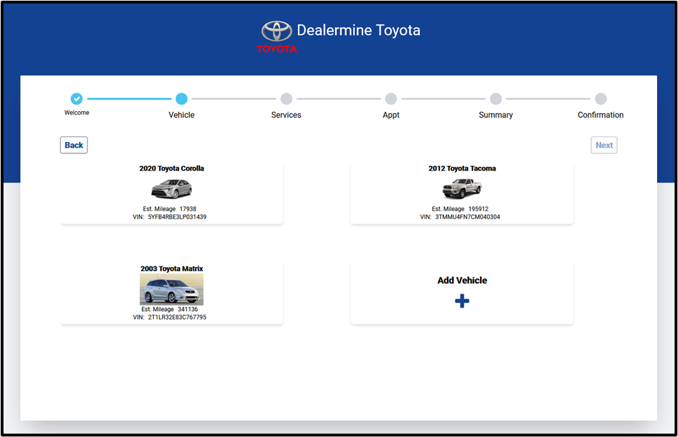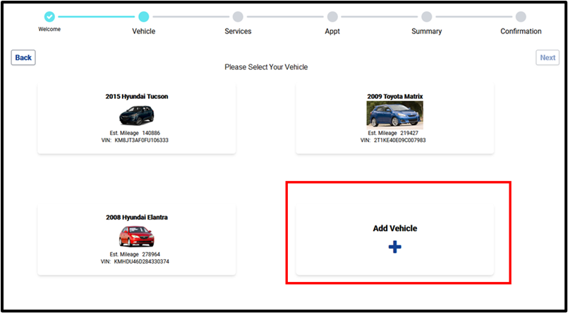 However, if the vehicle a customer is booking the appointment for IS NOT displayed or they do not wish to complete the 2 factor authentication process, they can opt to add a new vehicle to their file, or click the back button and try another search method.