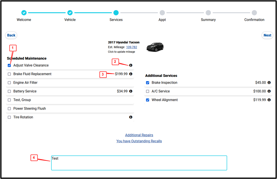 On the left side of the screen, Factory Recommended services, pricing and service descriptions will display based on the selected Hyundai vehicles Year, Make, Model, Trim and Mileage. This information is pulled directly from Quorum into the Online Scheduling System, via our integration with them.