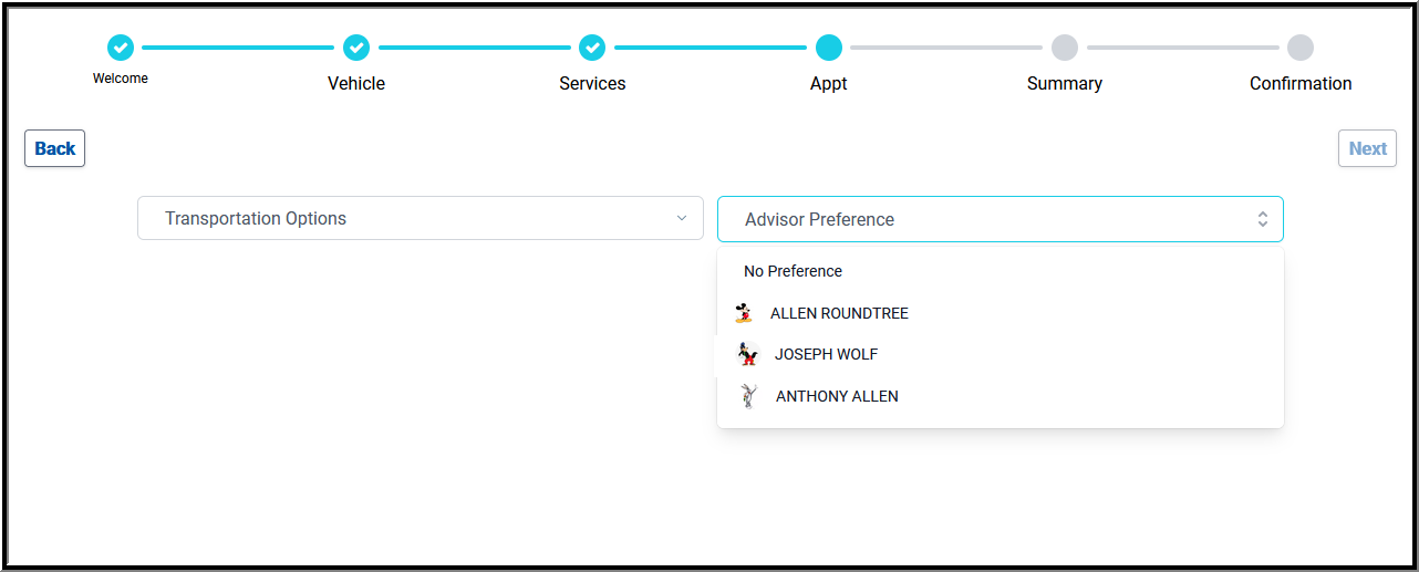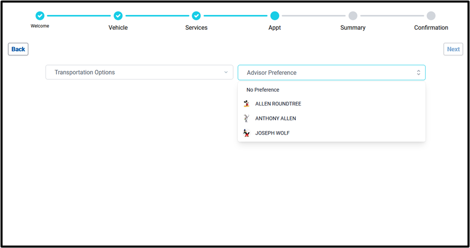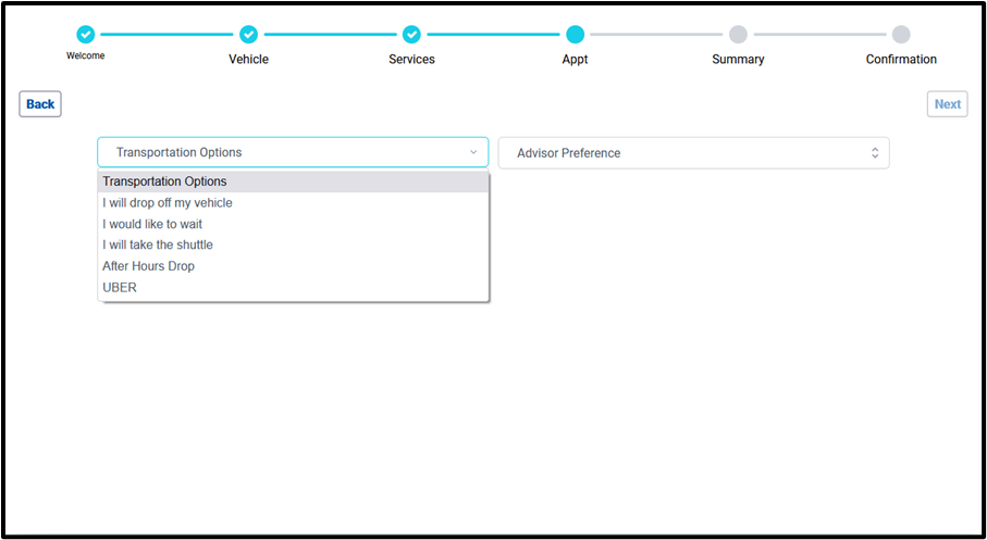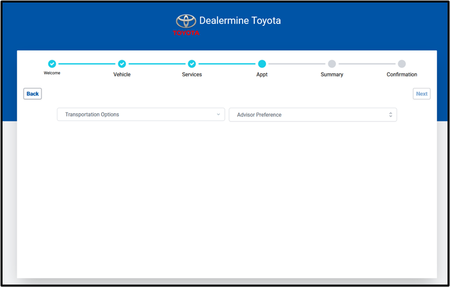 We have added a new features to the Advisor Preference drop down, called No Preference.When the transportation type has been selected, No Preference will appear and be selected by default for the Advisor. If this is selected, the appointment will be assigned to a random Advisor (Round Robin style) in Dealermine and the Date and Time pickers will display based on availability.