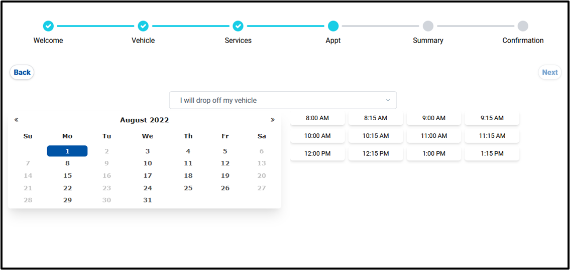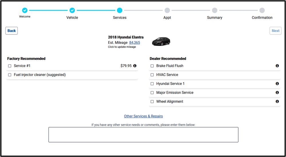 If the Online Scheduler is for a Quorum & Hyundai Dealership, this screen will display the same no matter which vehicle make has been input or selected, however the information put forth may differ between Non-Hyundai and Hyundai Vehicles.