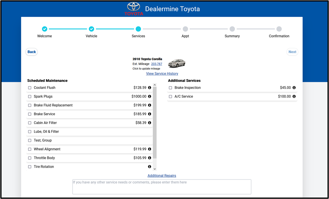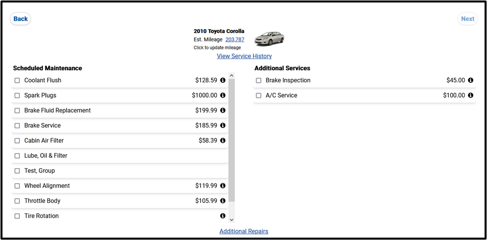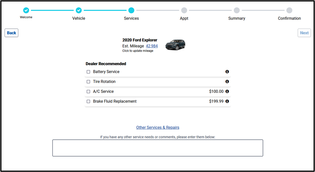 Once the vehicle has been selected, or the vehicle information entered, the customer will then have to click the Next button to be directed to the Services screen.