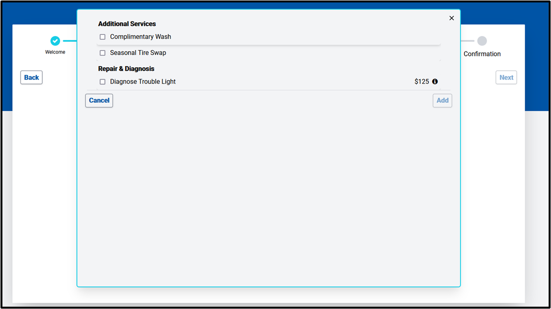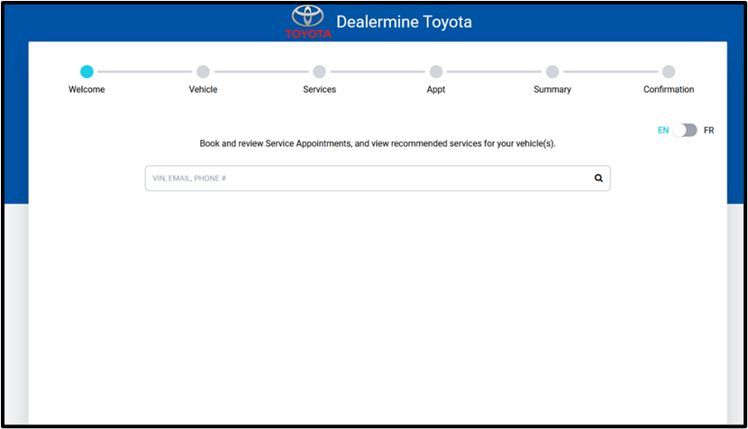 Now when a customer clicks the link to book a service online from a dealership’s website, they will be directed to a Landing page that gives them the option of entering their VIN, Email Address or Phone # to search for a file or they have the option to Sign In if they have previously set up an online account. Customers will also have the option to change their language preference to French by using the toggle in the upper right corner. We have also added the ability to display a logo and/or the display name in the header of the screen.