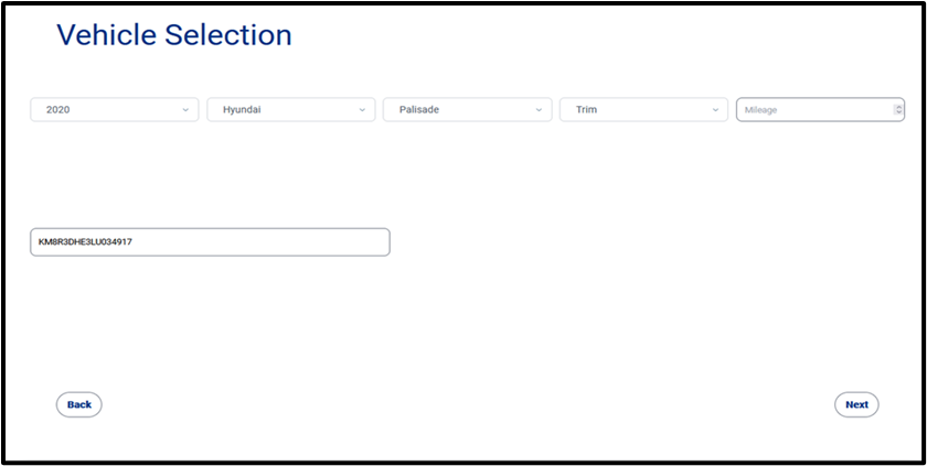 Customers are given the option to click the dropdowns and enter their vehicle information, or enter their VIN which, if the system is able to decode it, will populate the Year, Make and Model, of the vehicle. Customers will be required to enter the current estimated mileage. In the case of a Hyundai vehicle, customers will also be required to select a Trim option. Please note this only works with Canadian VIN codes.