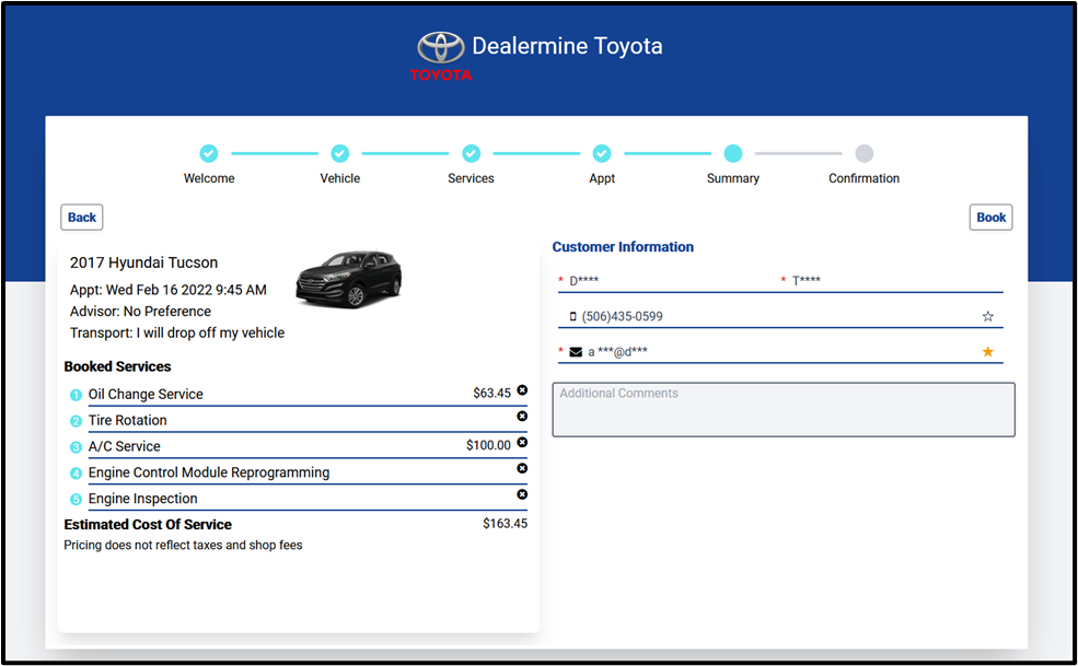 Once the date and time have been selected, and Next has been clicked, the customer is then taken to the Appointment Summary screen, where their vehicle information is once again displayed, along with a stock photo of their vehicle type. Also, the Day, Date and Time of the appointment will be displayed, as well as the list of services/repairs/recalls they have selected. Comments input on the Maintenance Selection screen will display in the comment section of this screen, and the customer has the opportunity to add more comments if they wish.
