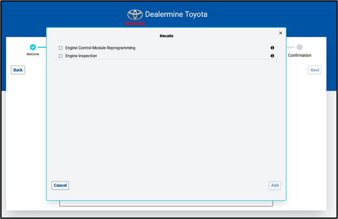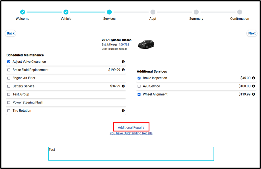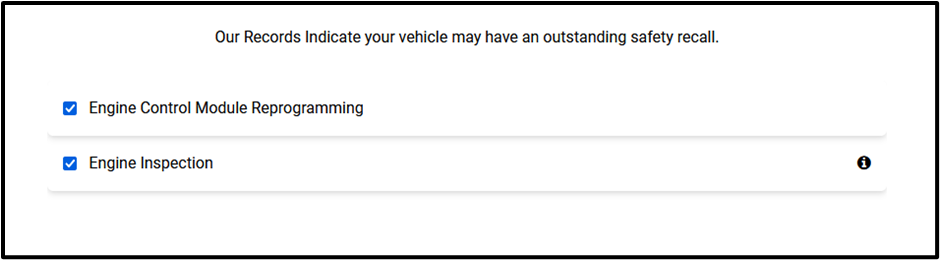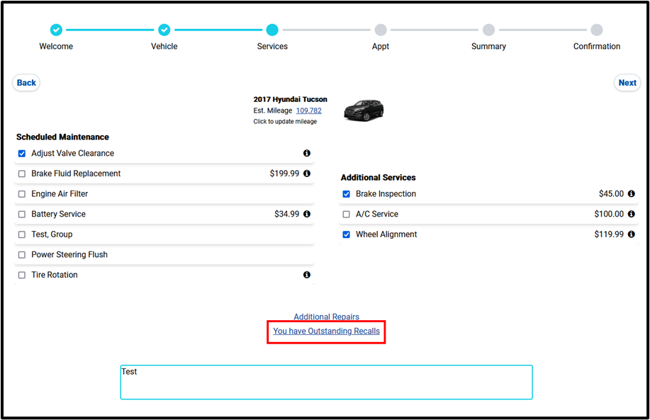 For Quorum & Hyundai Dealerships, when a customer has input a Hyundai VIN or selected an existing Hyundai vehicle, once they have made their maintenance selections or a comment regarding the appointment, if the system detects there are recalls for the selected vehicle, they will then be directed to the Recall Screen.