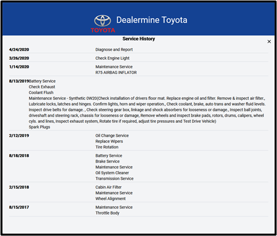 We have also added the ability for a customer to view the Service History of a vehicle found on their file. Customers can simply click on “Service History”, and a pop up will open that will display the complete service history, completed at this dealership, for the selected vehicle. If there has been no Services completed at this dealership for a selected vehicle, this option will not display.