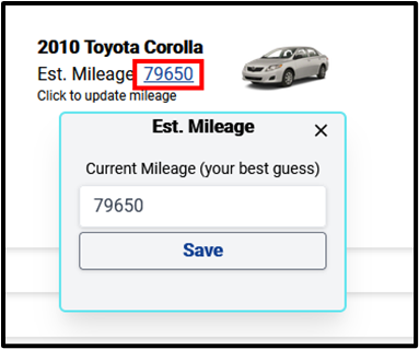 Additionally, customers are given the opportunity to update the Estimated Mileage by clicking on the displayed mileage, this will open a small pop up window, where they can make the change, and click the save button. When a mileage is updated, the maintenance service list(s) will refresh, and display all services appropriate to the mileage that has been entered.
