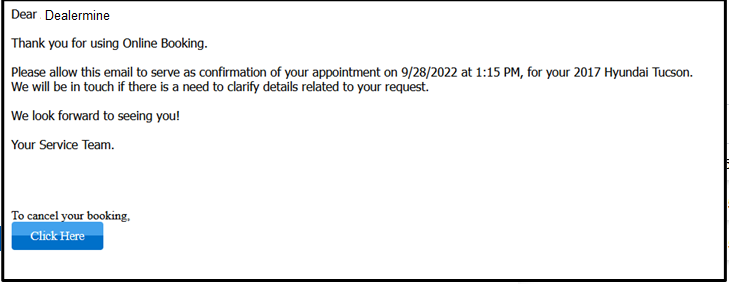 Since we have removed the ability for customers to “sign in” to an Online Scheduling account to view/edit/cancel existing appointments, a link has been embedded into the confirmation email that will allow a customer to cancel their appointment online if necessary. This link is automatically embedded in confirmation emails, and will only display if the appointment is booked via Online Scheduling.