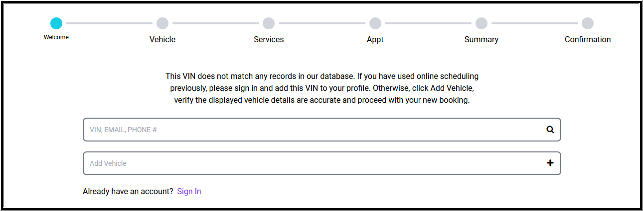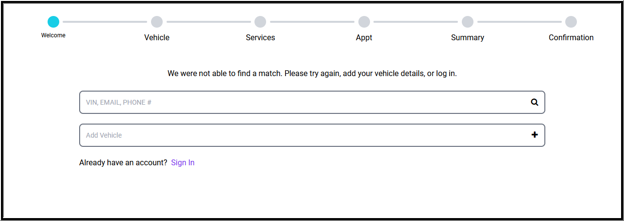If a customer uses an Email, or Phone number to search, and no matching file is found, they will be directed to the “Search again or Add Vehicle” screen, where they can either try a different method to search, or click “Add Vehicle” and continue with appointment process