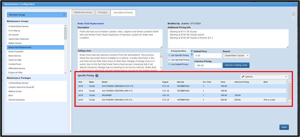 The right side of the screen will display the Dealer Recommended maintenance services, based on the maintenance schedules that have been built in Dealermine as well as any services that have been added to the Add Other Groups configuration screen. Please note, that services will not be duplicated from one list to another, provided the same opcode linked to a service in the Quorum system, is linked to the same mainteance group in Dealermine.