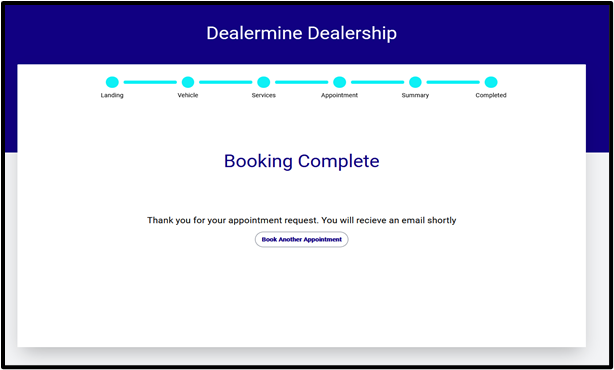 The confirmation message can be customized to suit the dealership’s wishes, and customers have the option to click the Book Another Appointment button to be taken back to the Vehicle page.