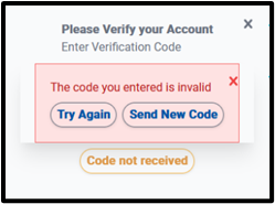 If the customer inputs the wrong code, they will receive a pop up error stating “The code you entered is invalid” and provide them with 2 options, they can either click Try Again, and be taken back to the pop up to enter their code, or click Send New Code, in which case a new code will be sent via text message, and they will be returned to the pop up to enter the new code.