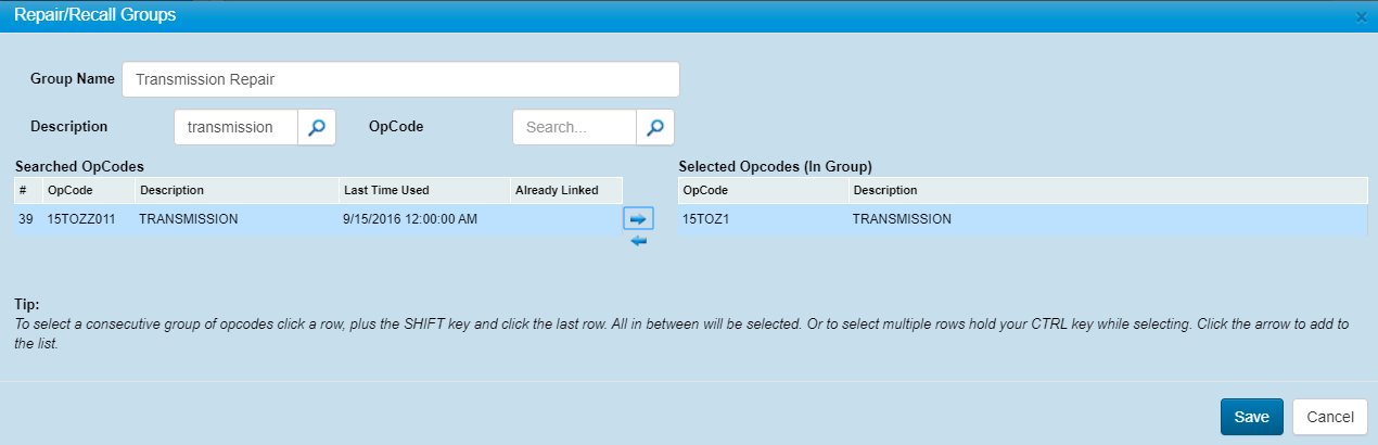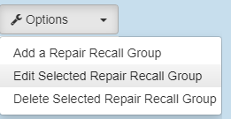 Edit Selected Repair Recall Group