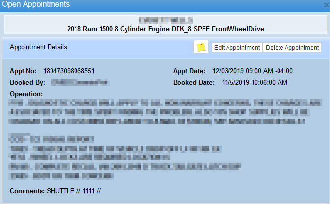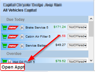 If a customer has a booked appointment it will display in the bottom left hand side of recommended maintenance as "Open Appt". The Open Appt indicator if VIN specific and will only show when the correct VIN is selected. When a user clicks the Open Appt indicator the Open Appointments popup will display.