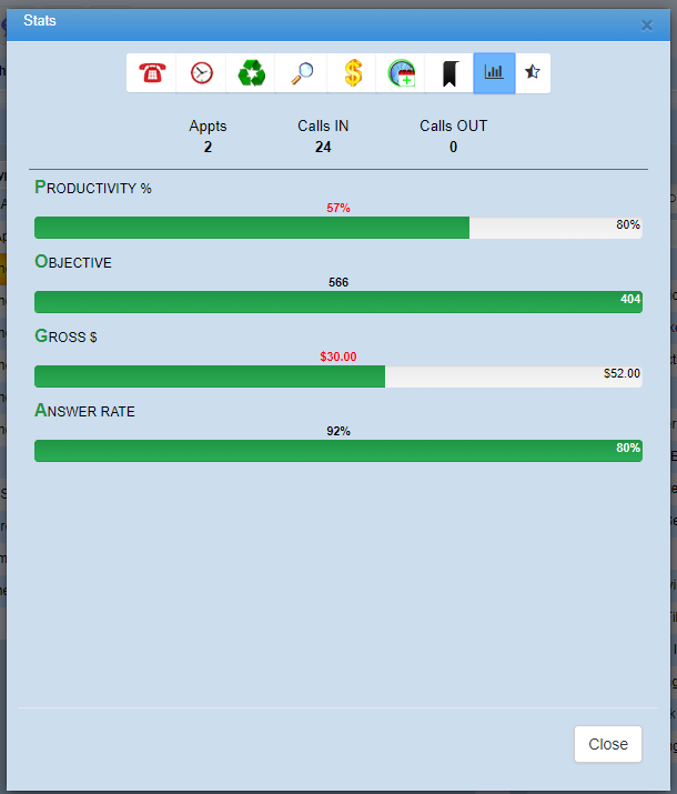Productivity - The goal here is 80% productivity for each individual user. This number is based on the amount of time spent on the phone, and in between phone calls. Basically, the more calls an Appointment Coordinator can make, in the least amount of time, will result in a high productivity level. When it comes to outbound & inbound maintenance calls, there are many ways we coach the appointment coordinators to maintain the quality of the calls while still keeping them short and sweet.Â