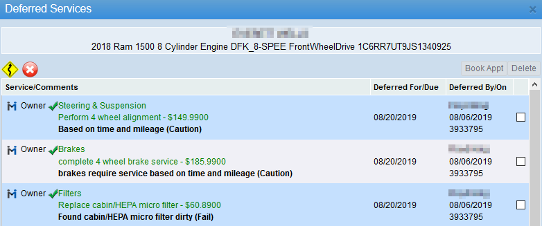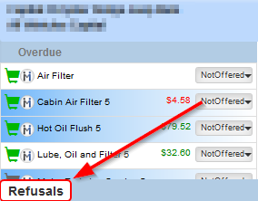 If a customer has declined services and the refusal was noted, the next time the customer is presented the refusal indicator will display in the bottom left of the recommended maintenance. By clicking on the Refusals indicator it will open a Deferred Services popup window.