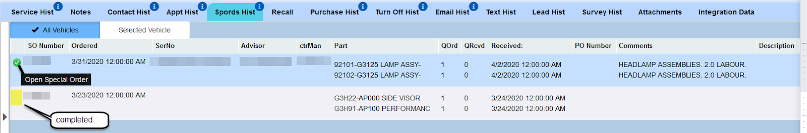 3. The Spord tab on a customer’s profile has been renamed to be “SPORD Hist” tab. This tab will now display all SPORD that have been ordered for the selected customer. If the SPORD has not been completed a green check mark will display at the beginning of line, if the Sport has been completed the green check mark will not display. The tab will have 12 columns;