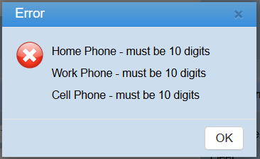 4. When adding/editing a customer’s number in the customer info screen, DealerMine will require the full 10 digit number to Save. If trying to save without the 10 digits users will see this error message. The error message will display which number is incorrect Hone, Work Cell or all 3 as in the screenshot.