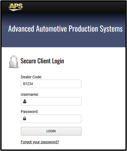 Clicking this button will open APS in a new window, where the dCode (Dealer Code) will already be populated, and the user can enter the Username and Password provided to them. After the first login of the day a session is stored so that subsequent logins aren’t necessary, until the beginning of the next work day.