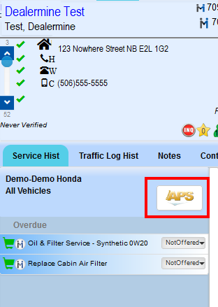 We have added a new feature that will allow users to open APS from within the DealerMine Application. The button to do so will be located in the Header of the Maintenance Menu on a customer profile screen.