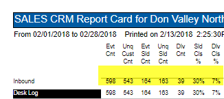 This report was created to help Sales BDC Managers, Sales Managers, etc. identify areas of opportunity within their Sales BDC and the Sales Floor. The Sales CRM Report Card provides details on the overall performance and allows the users to utilize a single report rather than running multiple ones. This report has multiple views which will allow the user to see various areas of performance/productivity.