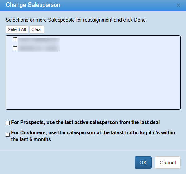 A pop up box will appear allowing you to decide who will be the new assigned Salesperson on each customer file. Select one or more for reassignment and click Done.