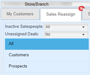 The Sales Reassign tool is designed for Sales Managers to oversee the dealerships portfolio and ensure all customers/prospects have an active Salesperson on file. The Portfolio will have a red orb on it, as will the Sales Reassign tab when their are deals needing to be reassigned. When a Salesperson is flagged as Inactive in User Setup their portfolio should be reassigned to another Salesperson to ensure future communication takes place.