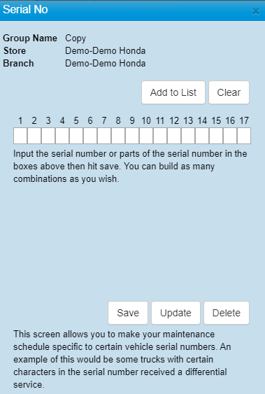 For example, (for some Makes and Models of Diesel Trucks) there's specific schedules, and the 8th character in the VIN is specific to diesel trucks. To create one of these schedules, click VIN specifications. The Serial Number window is presented on the screen.