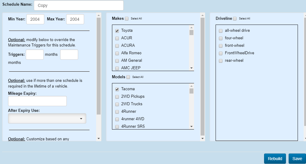Note: If nothing is checked off for Makes, Models, or Driveline the schedule will catch all. This will ensure that contacts are being made to customers with off makes.