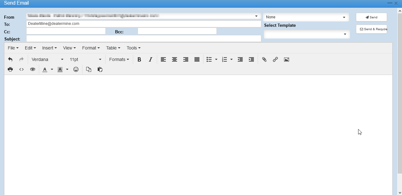 The email button will appear inactive until an email address exists in the customer information screen, click the Send Email button to view the send email screen.