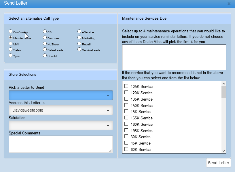 Maintenance Services Due - check any services you'd like to appear on your letter. *This is dependent on the service merge fields being added to the letter template.