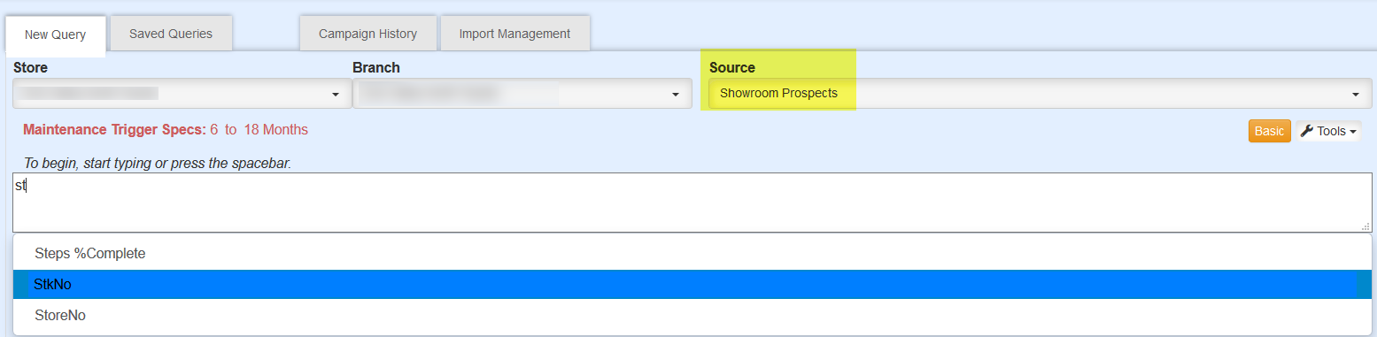 In Fetch a new field "stkNo" has been added to the Source Showroom Prospects. This will allow users to create a query for a specific Stock number or Stock number variation.