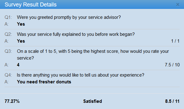 The pop up will display the answers the customer gave for each question and how much each question was scored.
