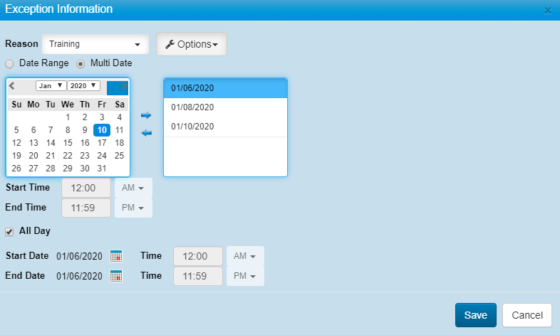 Exceptions/Vacations will block off any date, date range or Multi-Dates for any Technician when they are out of work. (Vacation, Sick, etc).