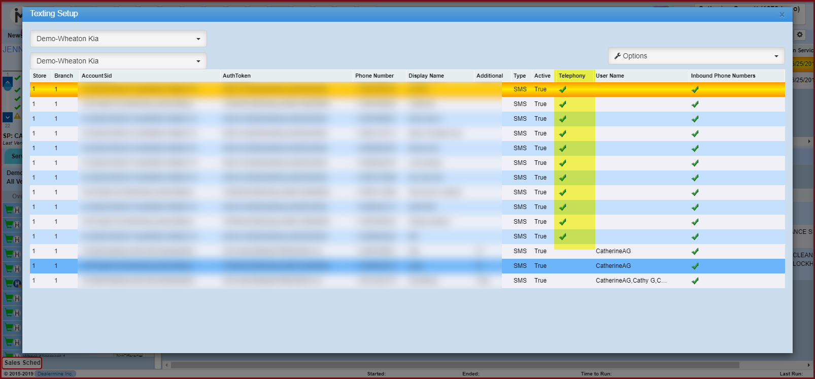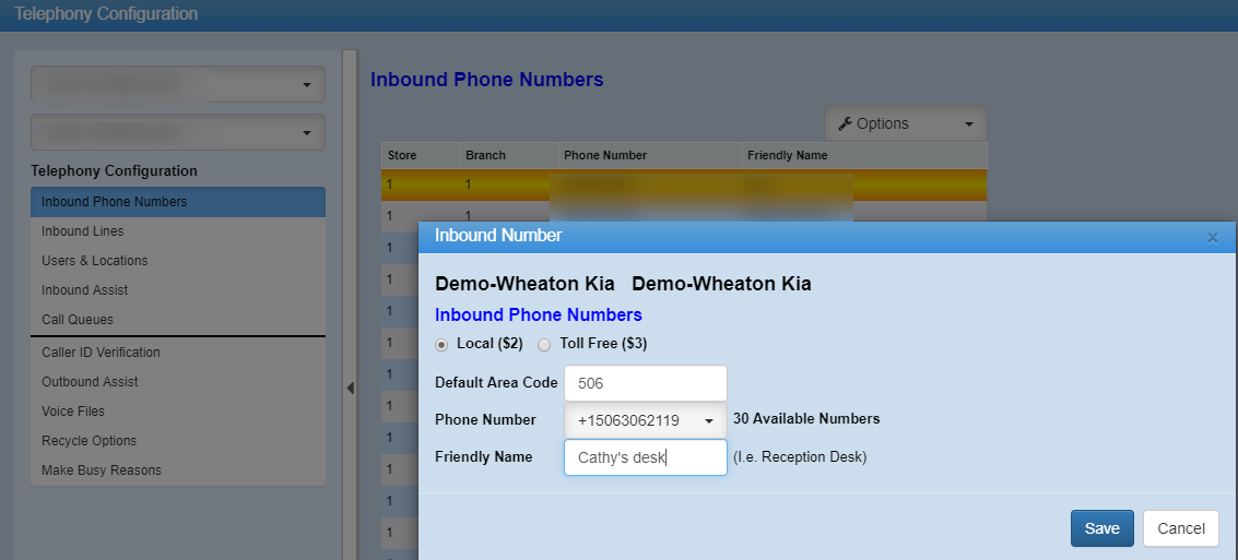 Click on "Buy Inbound Numbers" in the Telephony Setup section and then click on Options to Add an Inbound Phone Number. The Inbound Number popup will display and each dealership can decide between a local or toll free number. There will be a recurring fee of $2 or $3 per month, per number on top of any usage charges. Next enter the area code for the dealership and select any available phone number from the Phone Number drop down. If none are available you will need to choose another area code or choose a Toll Free number. Enter a "Friendly Name" to describe what this number will be used for, I.E. Reception Desk. After all the information is entered click on Save. When buying an Inbound number it will be SMS enabled and DealerMine will display this number in the Texting Setup screen. When the user loges into Telephony and are sending a Text they will have the option in the Texting screen from a drop down to select the number that would like to send the text from. The Dealership number or the Inbound number that was purchased in the Telephony setup. If this number is being deleted or edited from the Buy Inbound Numbers setup screen in Telephony Configuration then it will automatically update these changes in the Texting Setup screen.