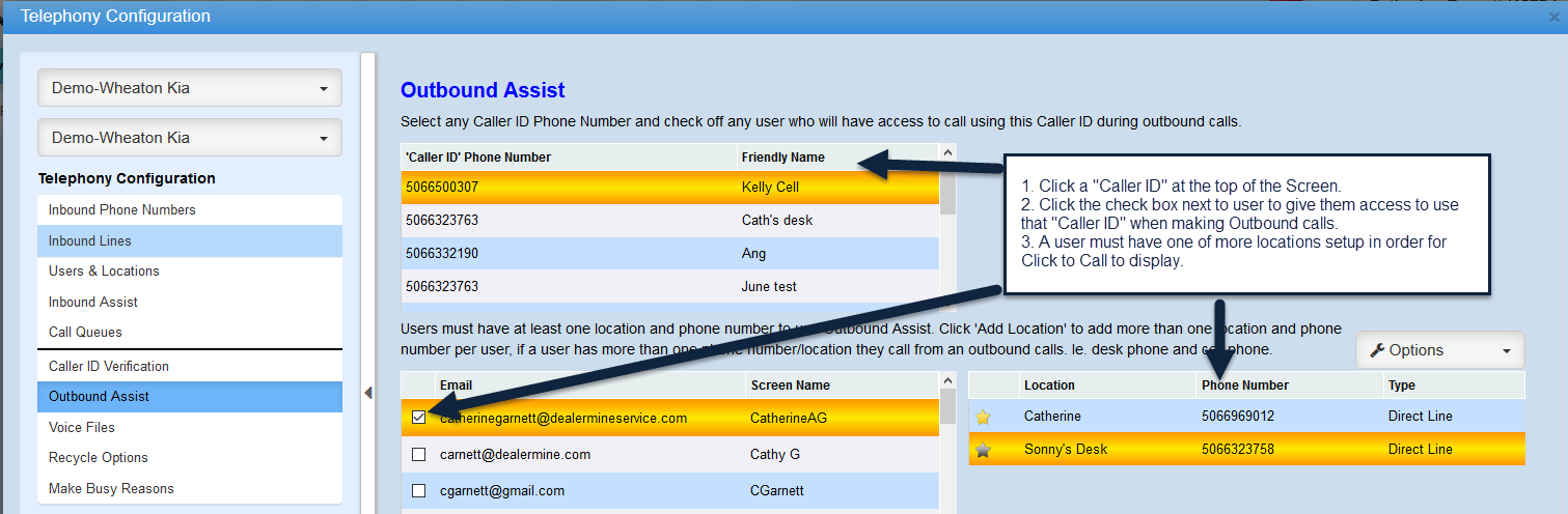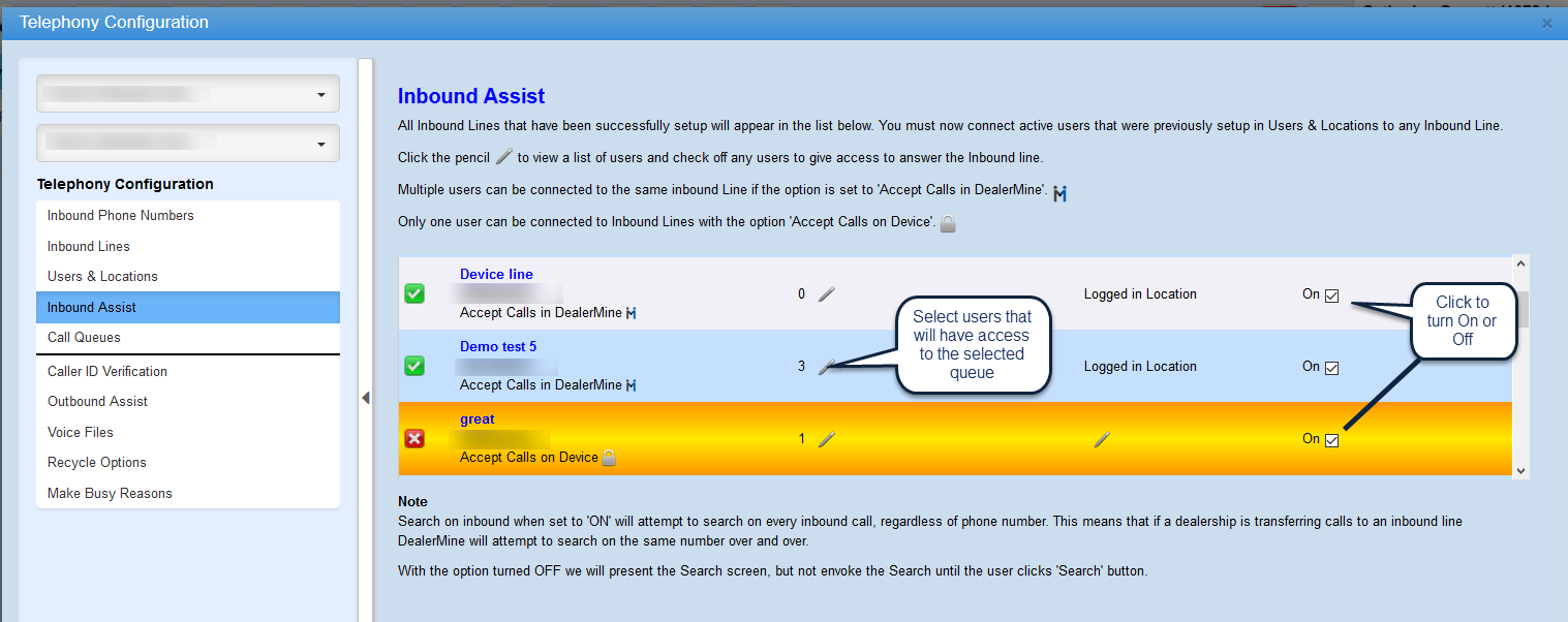 The Inbound Assist screen will display all users from Users & Locations that have one or more locations setup.  Users will be connected to Friendly Names in this screen and a location must be selected. On the grid in Users connected to Lines the user can click the pencil to view a list of users and check them off to give access to answer an inbound call. Multiple users can be connected to the same inbound line if the option is set to "Accept Calls in DealerMine" on the Inbound Lines screen. Only one user will be able to connect to an Inbound Line when the option is set to "Accept Calls on Device"Â