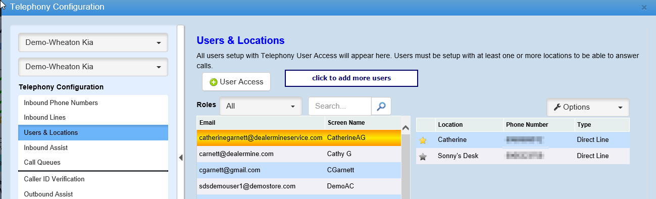 All users that have been given Telephony access in User Setup > User Access they will display on the grid or in the list when clicking on User Access, at this point they do not need any Locations setup. Access can also be given or taken from this screen as well instead of having to go to User Access, simply click on the "User Access" button and a list of all users will display, you can filter by Role or simply check to give access or uncheck to take access away and this will also update the Telephony User check box in User Setup > User Access. From the Filter by Role drop down a user can select which User Type they would like to allow this list to be filtered by. There is also a search field where a user can search by Email, Name, or Phone number. Â
