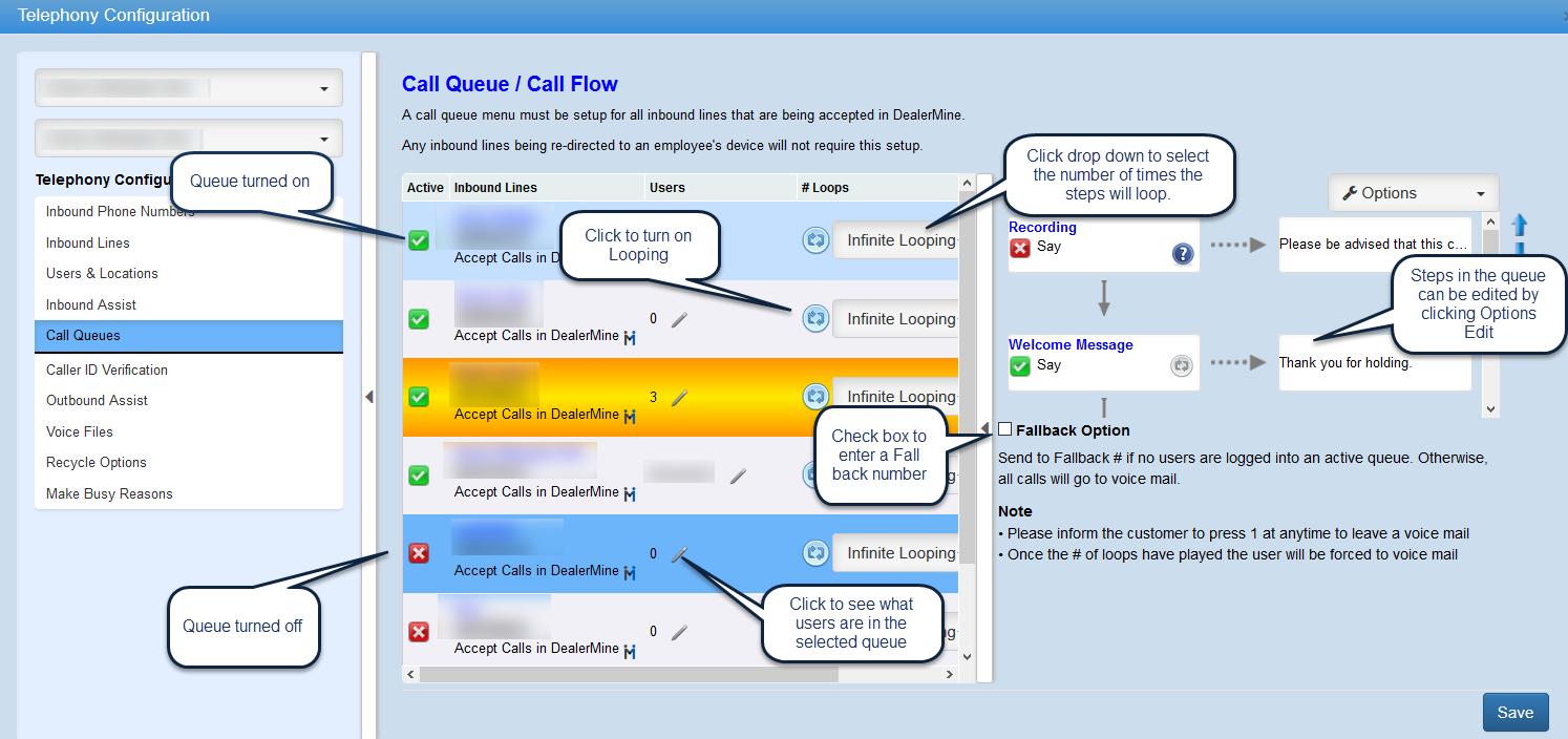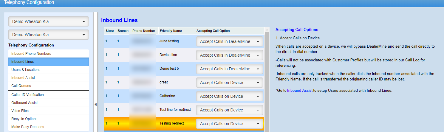 Inbound Lines - this will show the name of the Queue (the friendly name), the Inbound number that was purchased, and the Accepting Call Option that would have been selected in the Inbound Lines screen.