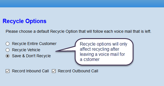 In the Telephony Setup section click on "Recycle Options" the Recycle Options screen will open and you are able to select how you would like the customer to be recycled "Recycle Entire Customer" is recommended. Click on Save. This again relates to when you're leaving a Voice Mail. After leaving a voice mail, DealerMine will obey the Recycle option saved.