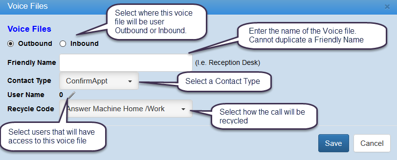 When a Voice file is recorded it will by default show on the Outbound grid and will require information in order to activate and if the Voice file is Inbound or Outbound. To activate a Voice File, click on the file to select then click Options > Add Voice Files. The Voice Files popup will display where the user is required to select Inbound or Outbound, enter in a Friendly Name, select a Contact Type and Recycle Code from the drop downs and then select a User Name from the User Access list, the select would be the user that will be using the Voice file. When done click save, and if Inbound was selected then it will show on the Inbound grid and the same for Outbound.Â