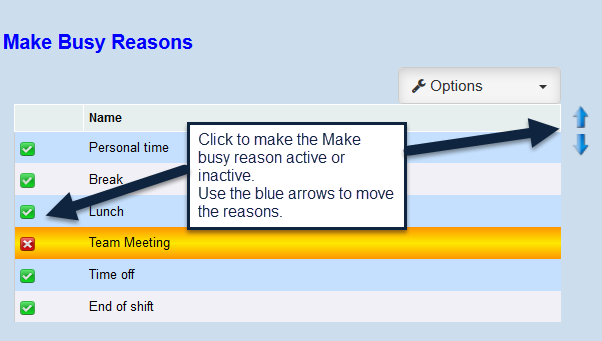 Make Busy Reasons screen the user will see these reasons when logging out of Telephony. The user can also use the arrows to change the order of the reasons by selecting one and moving them up or down to the correct position. When a user is logging out of Telephony these reasons will display along with the Log Out button, when selecting one of the Make Busy Reasons the user will be logged out of Telephony.