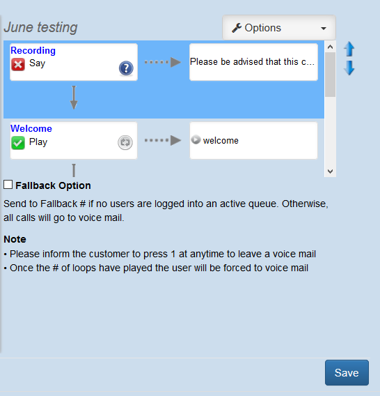 To the right of the Step the order arrows will display, the user can select a step to highlight and then use the arrows to more the step up or down to the Recording or Voice Mail (press 1) can not be moved as it is the last message played in the Queue.