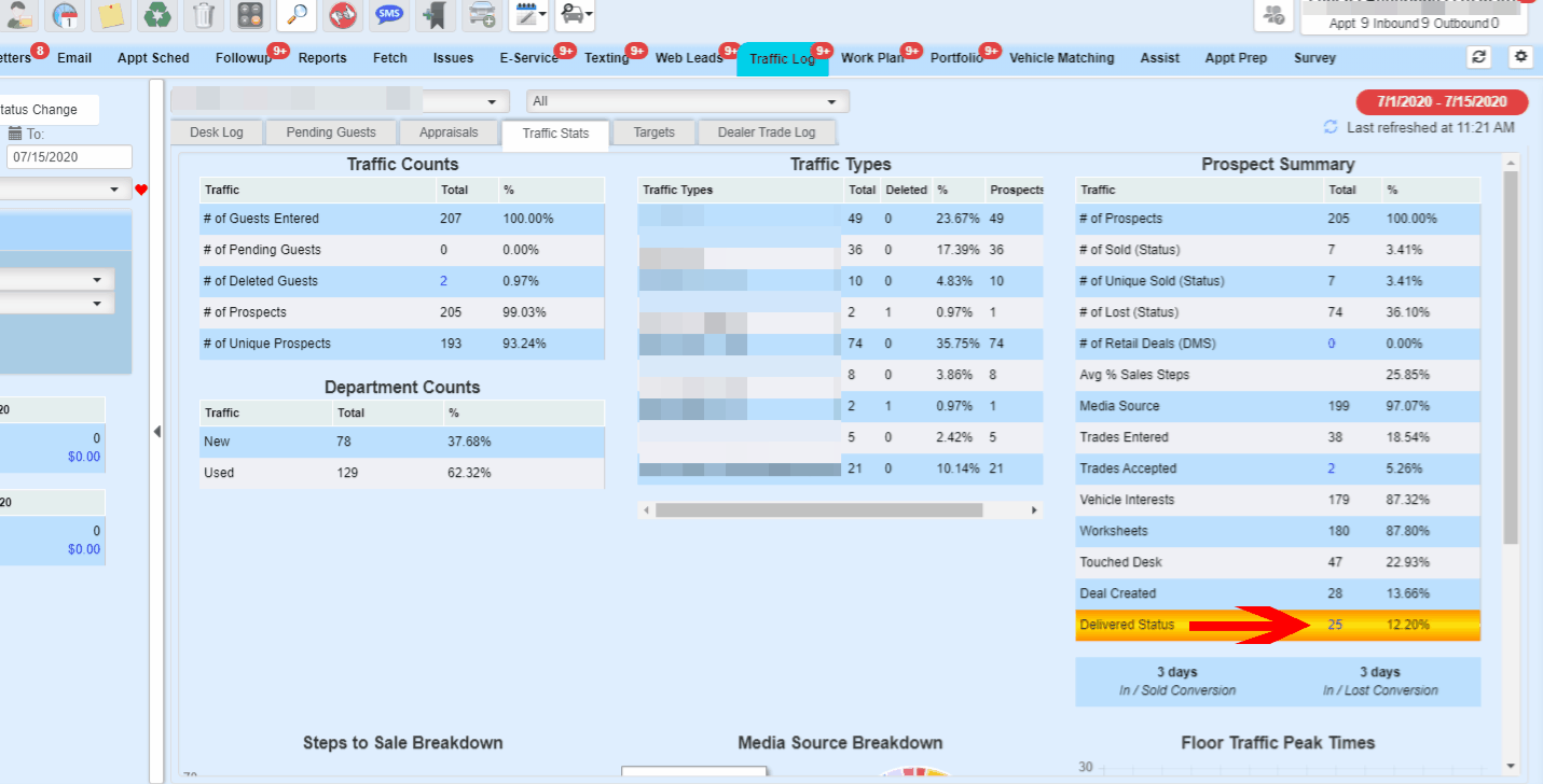 The Delivered Status shows how many traffic logs were changed to delivered status during the selected date or date range. Users can click on the number by the delivery status in traffic log stats to view customer details for each of the deliveries.Â