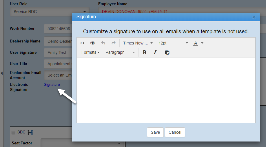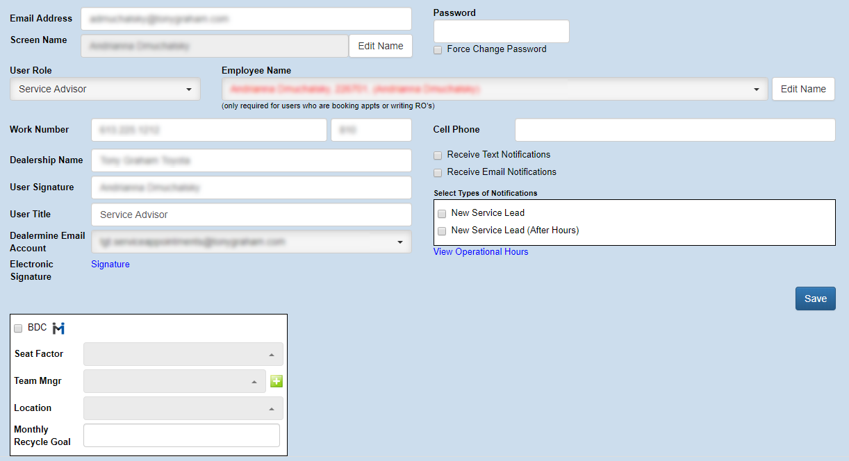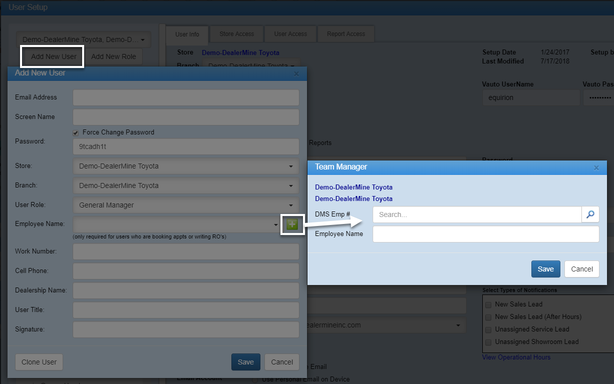 If you're adding an employee that already exists in the DMS, you can choose them from the "Employee Name" drop down. This will link their employee number to DealerMine for integration purposes.Â