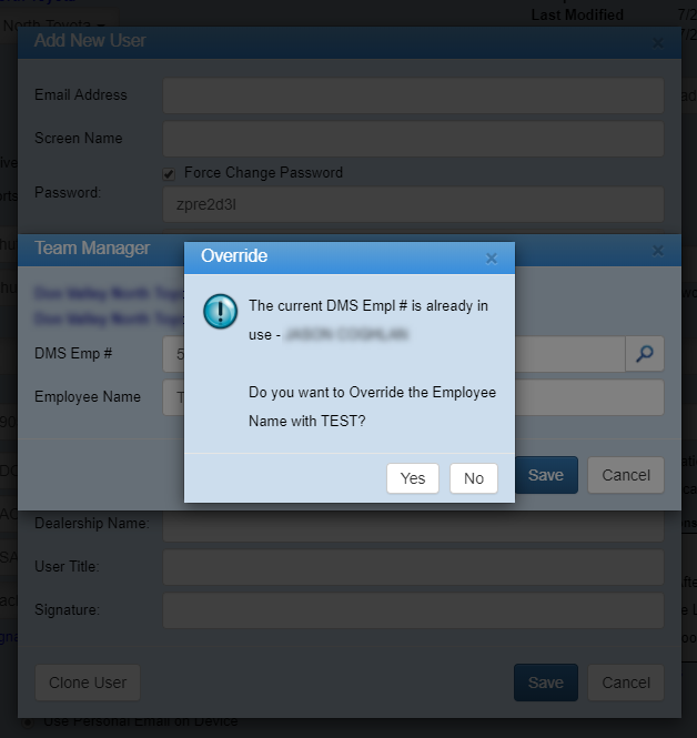 Some Dealerships recycle past employee numbers for new hires. If this is the case, DealerMine will give a warning saying that number is already in use. You can override by clicking "Yes".