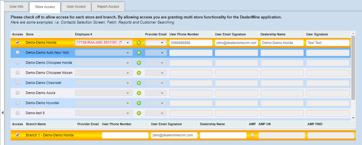 In this tab, we can give users access to multiple store/branches. The information you inputted when adding a new user will carry over to this tab, on the default store you've chosen for the user. Now we can give them access to multiple store/branches. Keep in mind, some stores have multiple branches, when you select the store, the branches will display at the bottom.Â