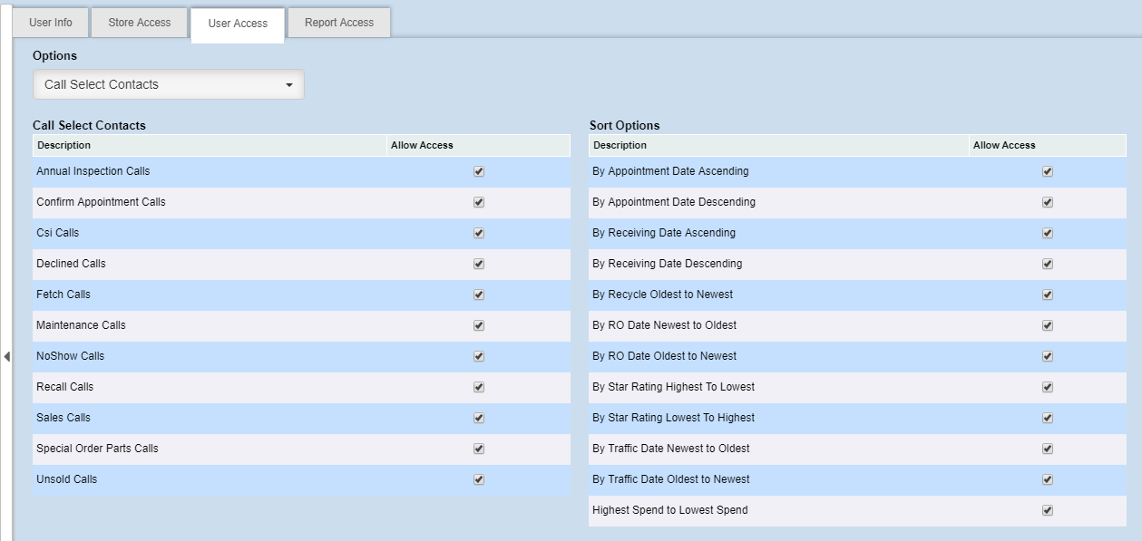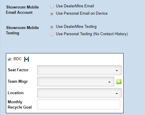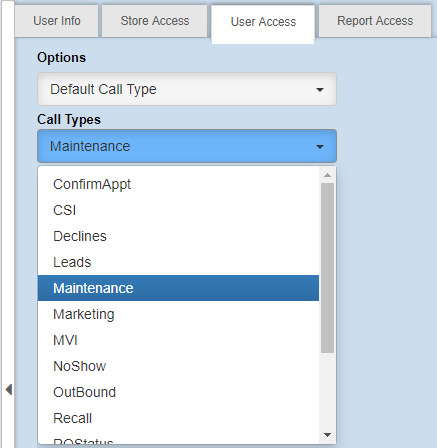 In this option, we can choose a default call type for the user. A Service BDC user will most likely always have Maintenance defaulted. A Sales BDC would have Sales or Showroom.Â