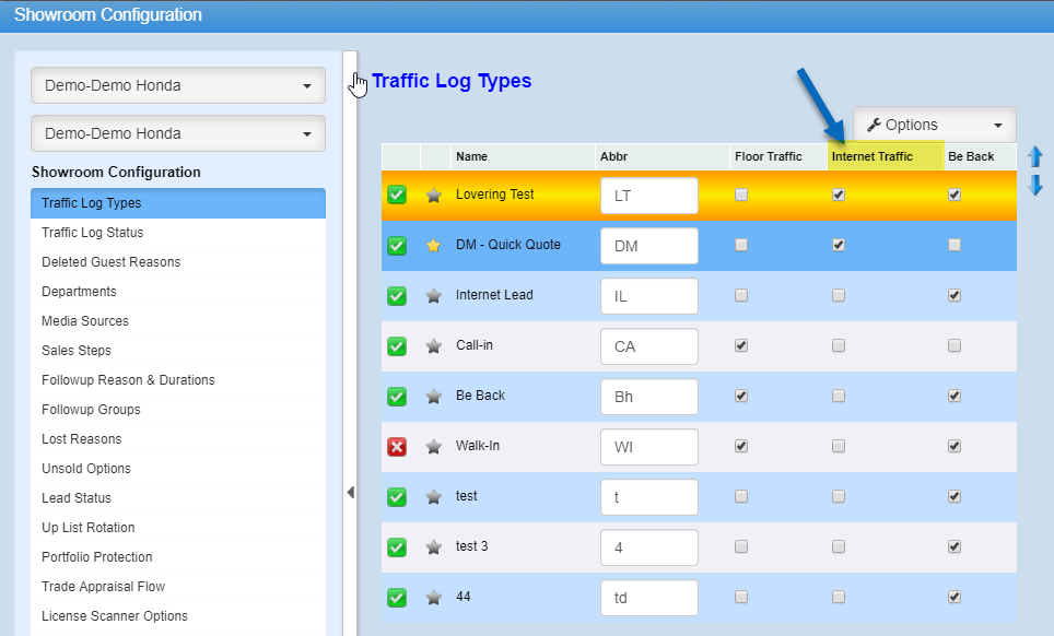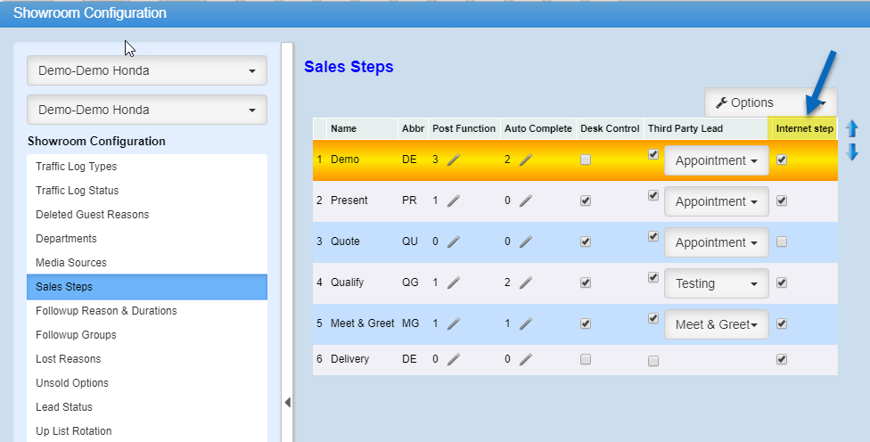 1. We have enhanced our “Showroom Configuration” specification screen. In “Traffic Log Types” we have added a new column named “Internet Traffic”. In “Sales Steps” we added a new column named “Internet Steps”.