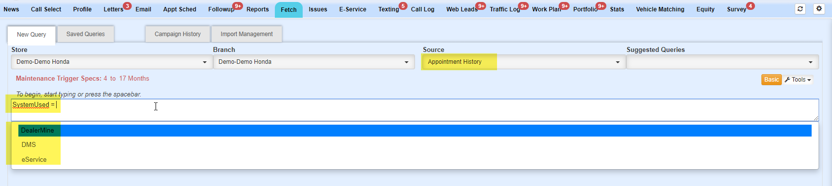1. In “fetch” a new field was added in the “Appointment History” source. This add-on allows user to detect which source appointments are being booked from; Dealermine, DMS, or eService.